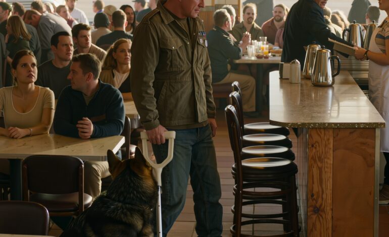 Toute la table éclata de rire, et Olivia resta là, immobile, son plateau à la main, le regard fixe, l’expression neutre. C’est alors que la première personne entrée dans le restaurant remarqua quelque chose d’étrange. Dans la banquette du fond, un homme était assis seul, vêtu d’un sweat-shirt sombre. Pas de bière, pas de nourriture, juste un café. À ses pieds, à moitié caché sous la table, se trouvait un gros chien de travail. Pas un animal de compagnie, pas un petit chien de famille. Un vrai K9. Les oreilles dressées, le corps immobile, les yeux scrutant les alentours. Le chien n’aboyait pas, ne bougeait pas, mais il observait les motards comme s’il devinait déjà leurs dix prochaines erreurs. Les mains de l’homme étaient détendues, mais sa posture ne l’était pas. Il était d’un calme qui n’était pas de la timidité. C’était un calme acquis. Et Olivia, sans tourner la tête, déplaça son regard juste assez pour l’apercevoir dans le reflet de la machine à café.